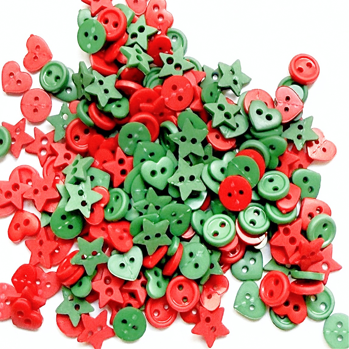 Christmas Garland Tiny Buttons includes tiny round, hearts and stars buttons in Christmas colors: Red and Green.