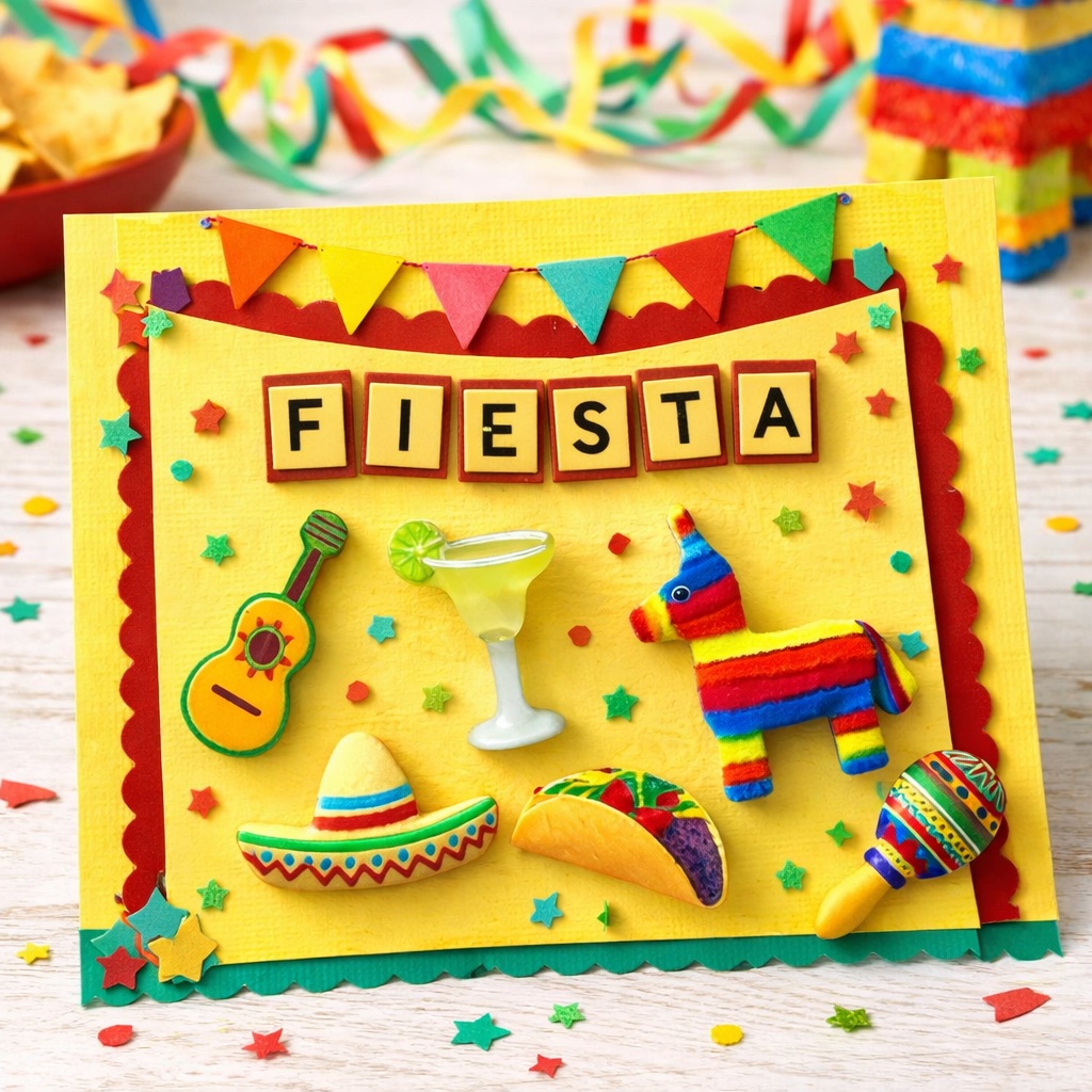 - Pieces include: Guitar, sombrero, piñata, taco, margarita, maraca