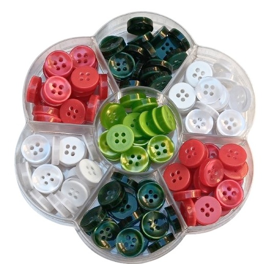 Add a burst of Christmas color to your next needlepoint, quilt, or sewing project with this delightful assortment of back-to-basics sewing buttons. Featuring an eye-catching palette of 140 Christmas 1/2 inch buttons in hues like red, white and greens, this classic 4-hole collection with a pearlized finish is perfect for crafters who appreciate a touch of nostalgic charm. Whether you’re embellishing a handmade garment, scrapbooking a colorful memory, or creating button art for your walls, these versatile, holiday color sewing buttons are an ideal addition to any crafter’s treasure trove. Rekindle the simple joys of making with your hands and these vibrant buttons.