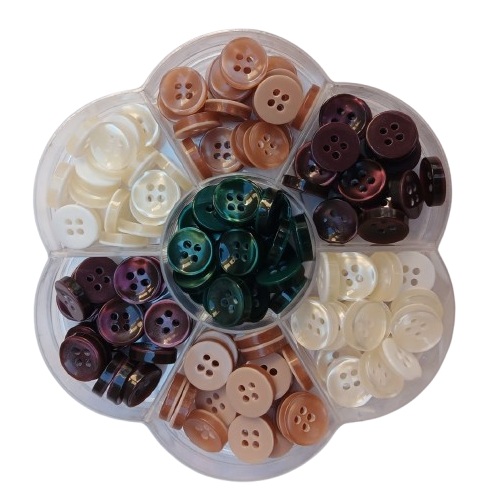 Calling all quilters, needle-pointers, and scrapbookers! Bring an earthy, homespun touch to your next project with this cozy color wheel of sewing buttons and craft buttons. This back to basics with sewing button color wheel set features a palette of dark green, brown, tan, and ecru buttons in a pearlescent finish. At 1/2 inch with 4 holes each, these versatile little toppers are perfectly sized for needlepoint, quilting, scrapbooking, and all kinds of button art. Their lustrous yet understated tones evoke a rustic, vintage-inspired feel that’s ideal for crafting cozy afghans, nature-themed scrapbook pages, and more. Unwind with a familiar craft while adding elegant flair.